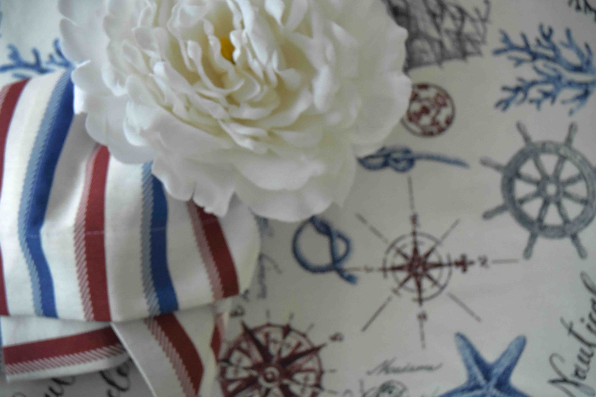 Una pieza que parece contar historias de barcos, marineros y cartas de navegación. Los cabos marinos impresos en rojo y azul evocan travesías, exploraciones y rituales de costa. Perfecta para mesas con alma viajera o para quienes saben que el mar siempre llama.